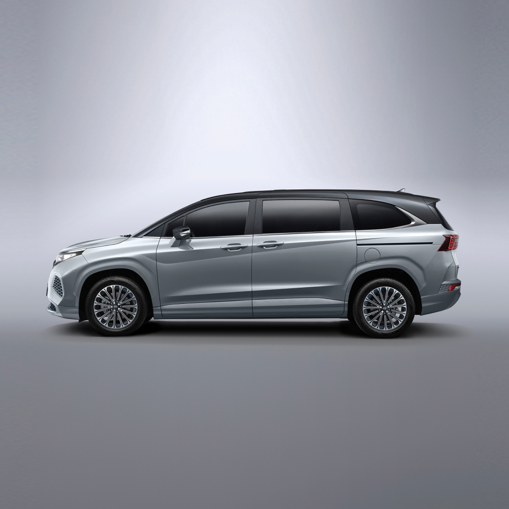 车身侧面凌厉的腰线配合车身同色侧裙、保险杠底部高亮镀铬护板,营造出极具未来感的悬浮姿态,短前悬长轴距的设计使得整体车身比例更为协调。
